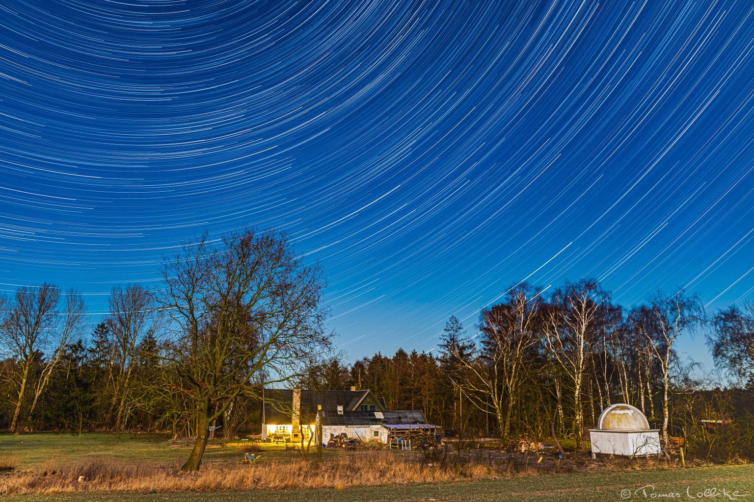 A startrail photo from out in the fields looking back at my house and garden 🙂