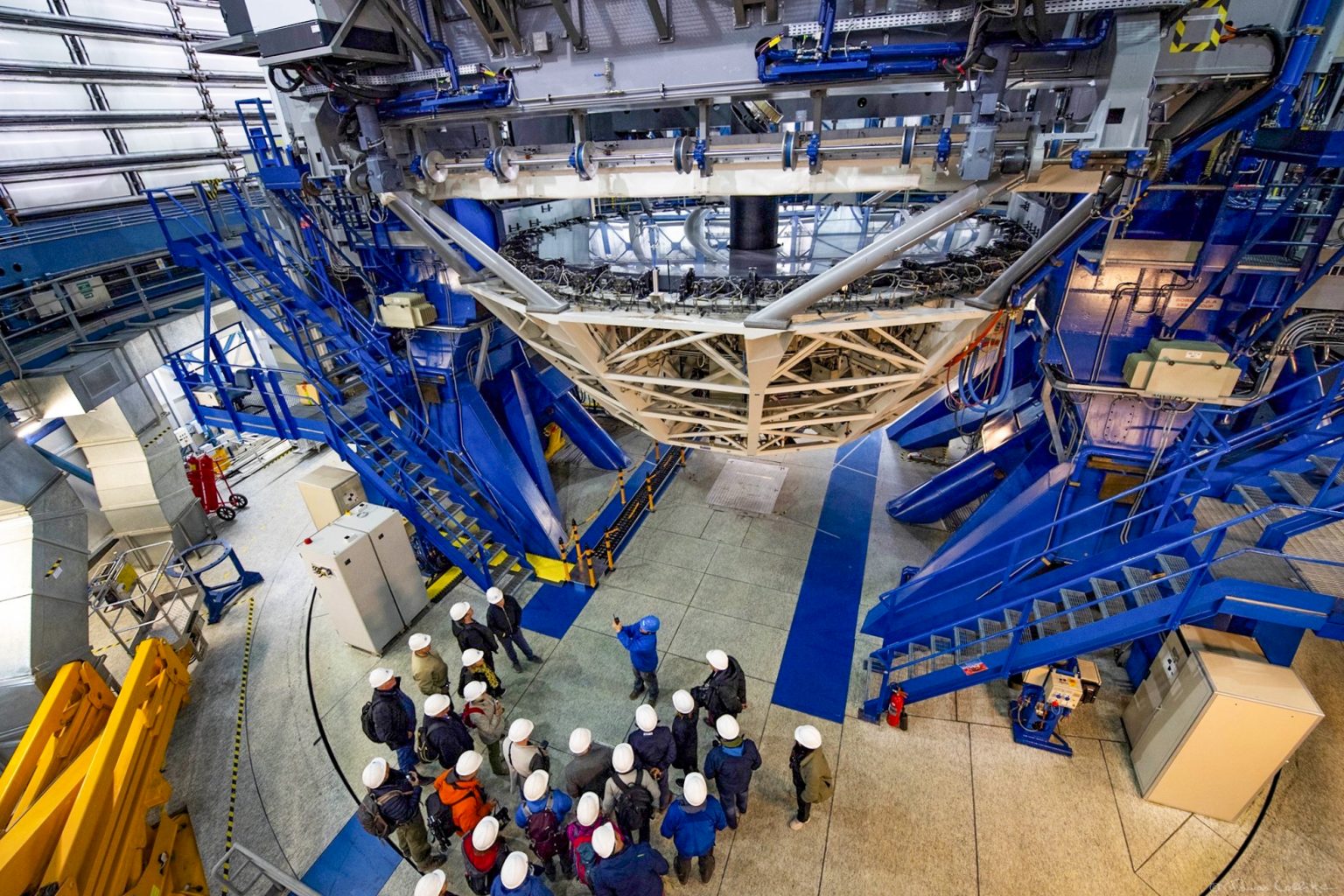 People standing under the main mirror of the Unit Telescope, Yepun, at European Southern Observatory’s (ESO) Very Large Telescope (VLT)